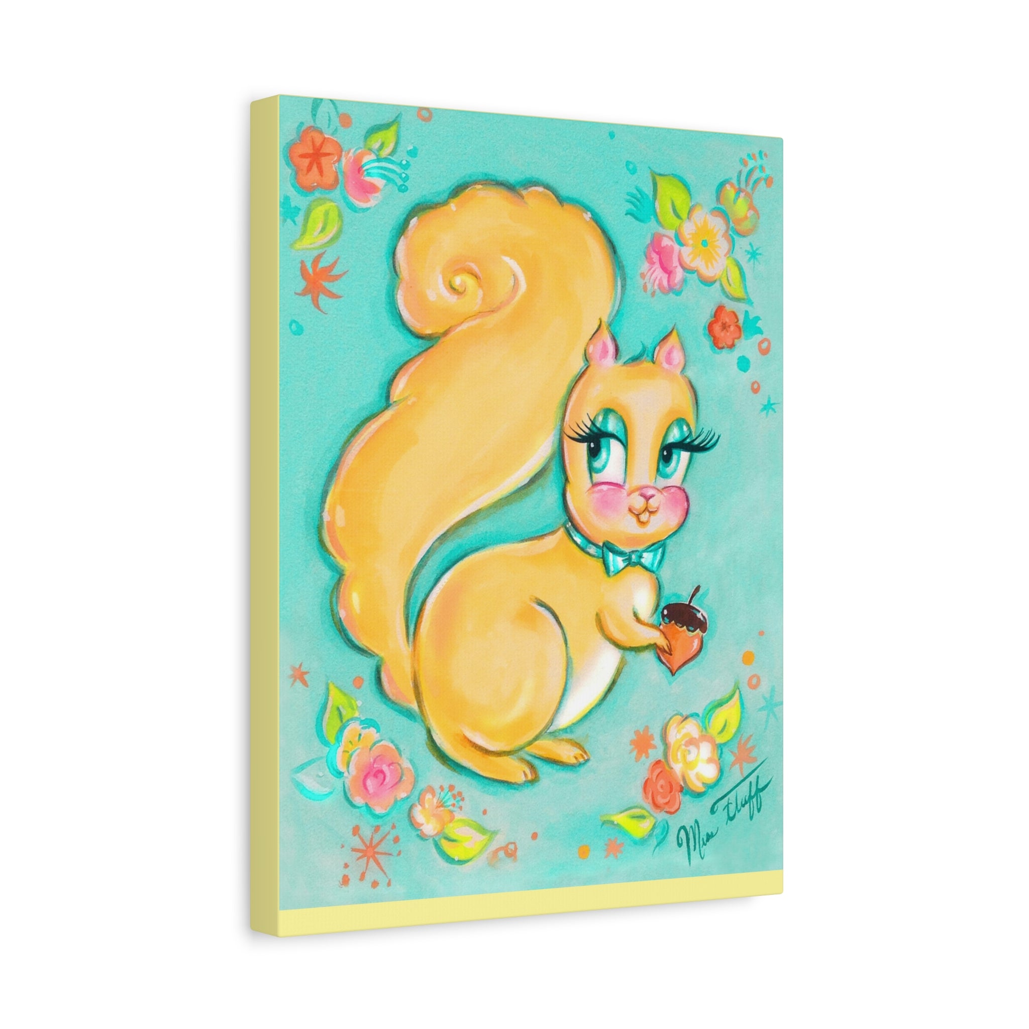 A beautiful stretched canvas print featuring a very cute squirrel smiling with her little acorn. Inspired by vintage decal art from the 1940's and 1950's. Original art by Claudette Barjoud, Miss Fluff ❤︎